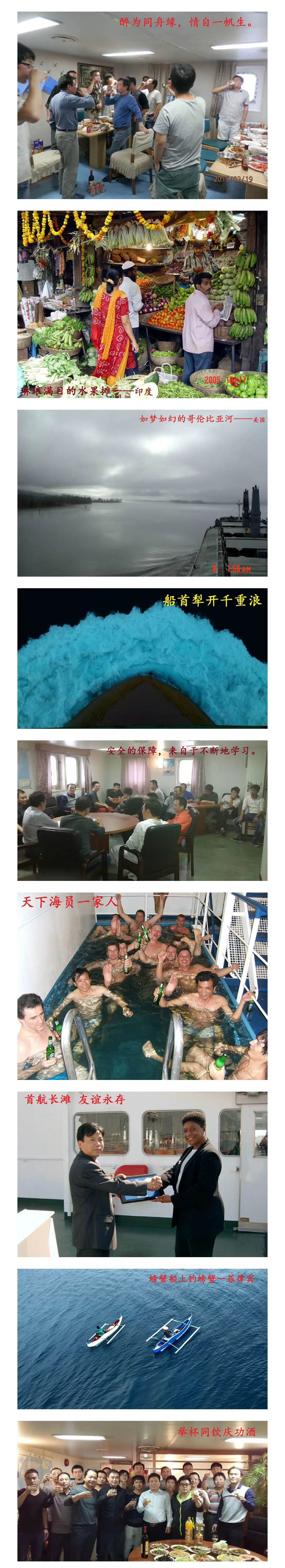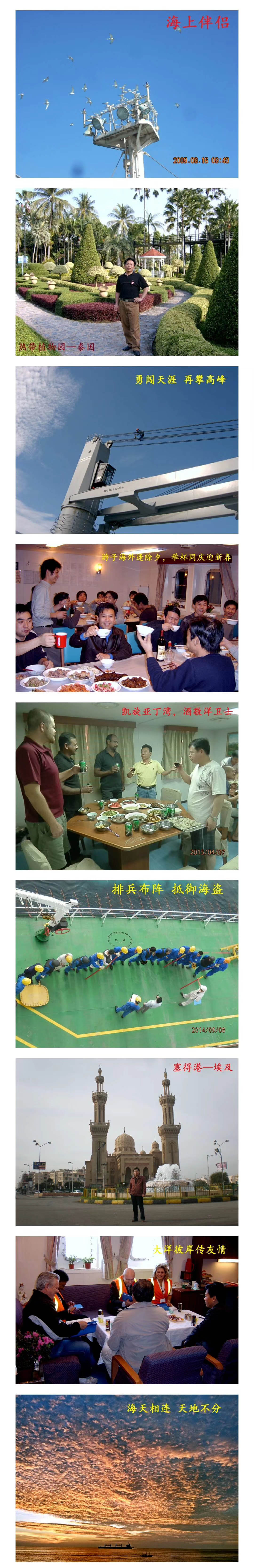 再過數(shù)日,三十八年的航海生涯就要畫上句號(hào)了?;叵肫疬@一路走來的風(fēng)雨歷程,真是感慨萬千。想當(dāng)初一名懵懂的毛頭小伙,滿懷著激情,充滿了希望,興高采烈地踏上了萬噸巨輪,從一名實(shí)習(xí)生、二級(jí)水手、一級(jí)水手、駕助、三副、二副、大副,直到1998年擔(dān)任遠(yuǎn)洋船長,將自己的青春,最燦爛最美好的年華灑向了茫茫大海。這些年,我們駕巨輪、乘長風(fēng)、破巨浪,遨游滄海。世界上最著名的三大運(yùn)河:蘇伊士、巴拿馬、基爾,都留下了我們難忘的足印,最有名的大風(fēng)浪區(qū):好望角、比斯凱灣、百慕大魔鬼三角區(qū),都留下了我們豪邁的吼聲,世界上各個(gè)角落,也留下了我們美好的回憶。三十八年航海生涯,飽經(jīng)風(fēng)霜,艱辛曲折,與天斗,與海斗,航經(jīng)索馬里海域等還要與人斗。但是我一生無悔,因?yàn)檫@一路上我已經(jīng)盡心盡興了,在我一生中擁有了一個(gè)完美的旅程。在此我要特別感謝曾經(jīng)與我同舟共濟(jì)的船員兄弟們,是你們給了我戰(zhàn)狂風(fēng),斗惡浪的勇氣和力量,這段兄弟般的友情我會(huì)永遠(yuǎn)銘記在心中。